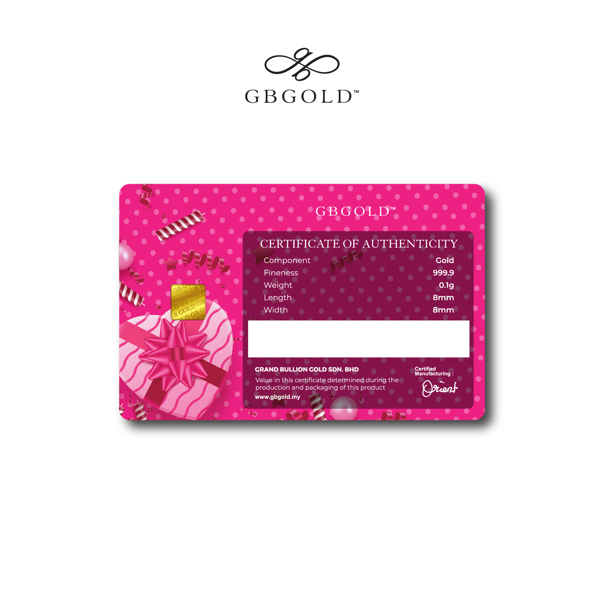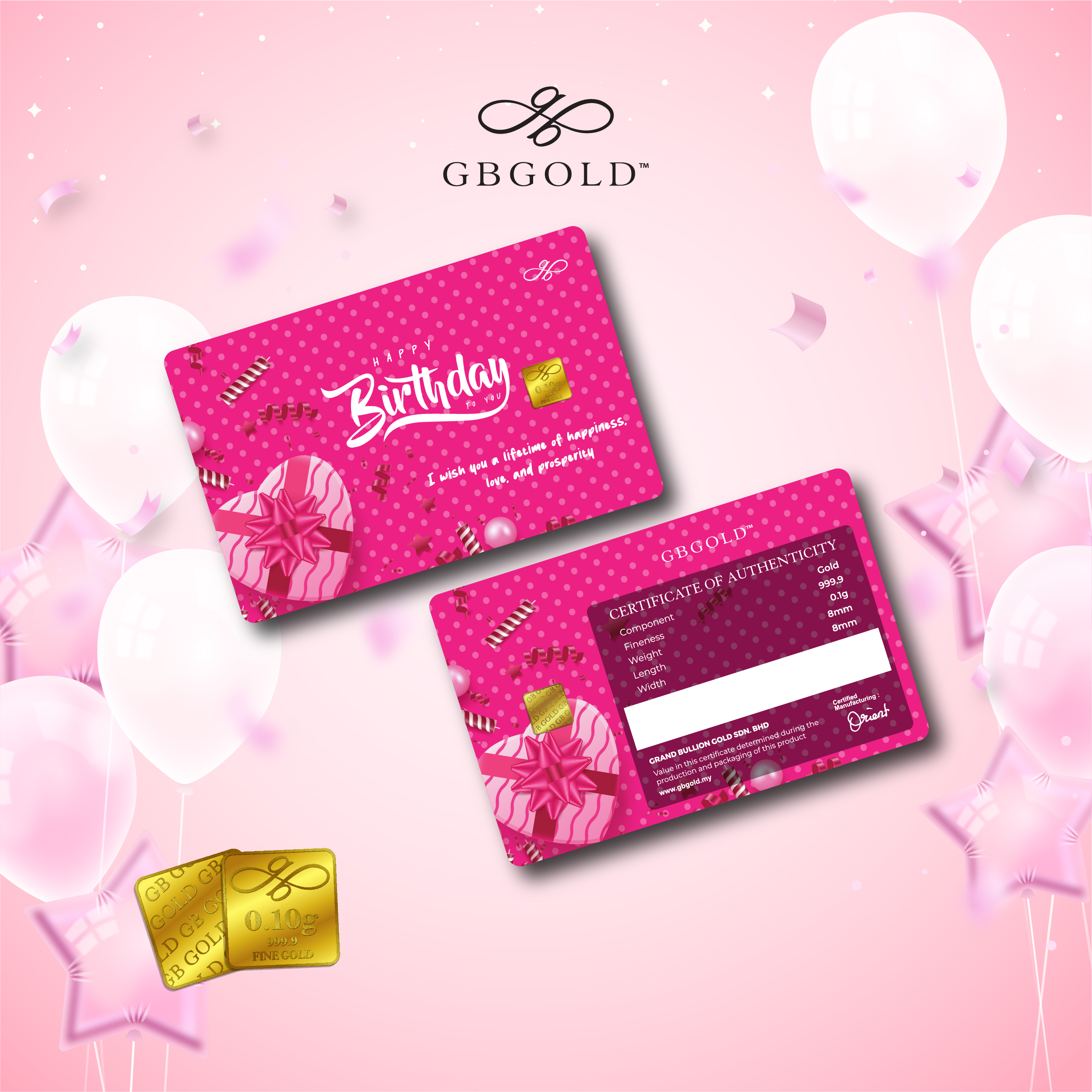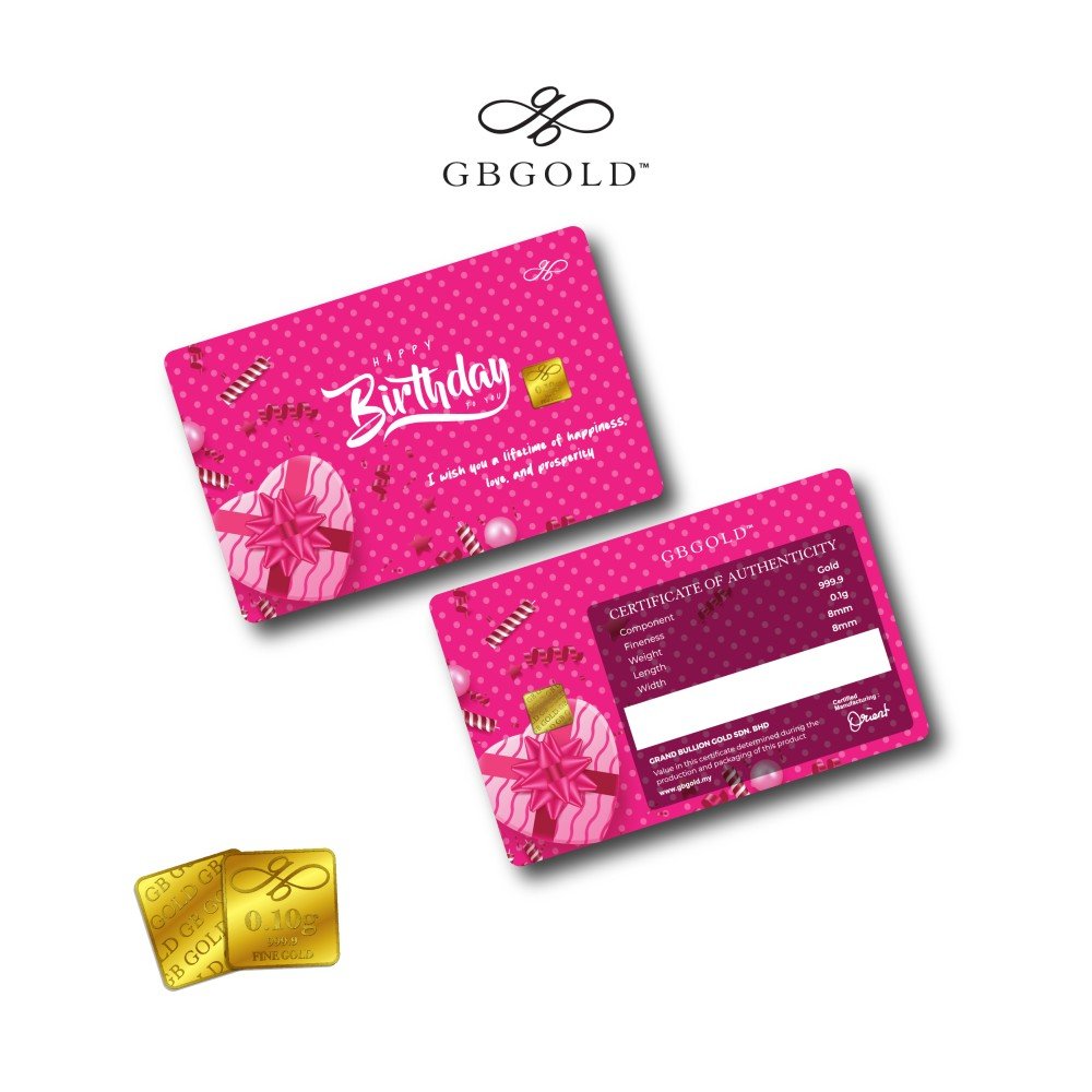 Introducing the GB GOLD Happy Birthday Bubble Pink Gold Bar 0.1g (Emas 999.9), the perfect addition to your collection of gold decorations and accessories. Crafted with 999.9/24K purity, this gold bullion bar is a must-have for any discerning collector.